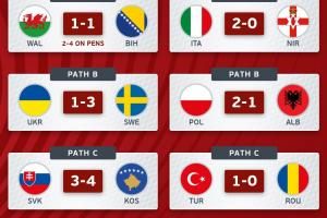 体育资讯3月27日讯 世预赛欧洲区附加赛结束半决赛争夺,意大利、瑞典、土耳其、丹麦等队晋级,各路径决赛对阵为波黑vs意大利、瑞典vs波兰、科索沃vs土耳其、捷克vs丹麦。